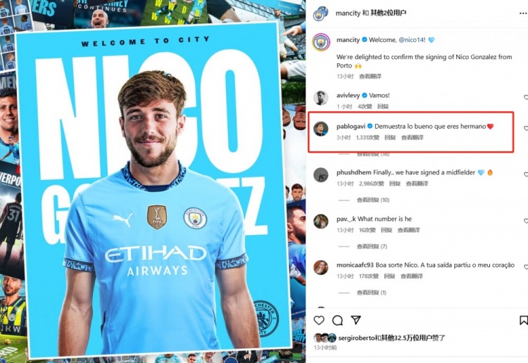 在尼科-岡薩雷斯和曼城官方的官宣動態(tài)下,巴薩中場加維進(jìn)行了評論,向前隊(duì)友送上了祝福。