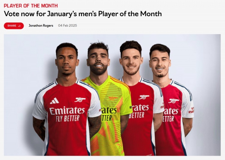 2月4日訊 阿森納官方公布1月隊內(nèi)最佳候選,加布里埃爾、拉亞、賴斯、馬丁內(nèi)利獲提名。
