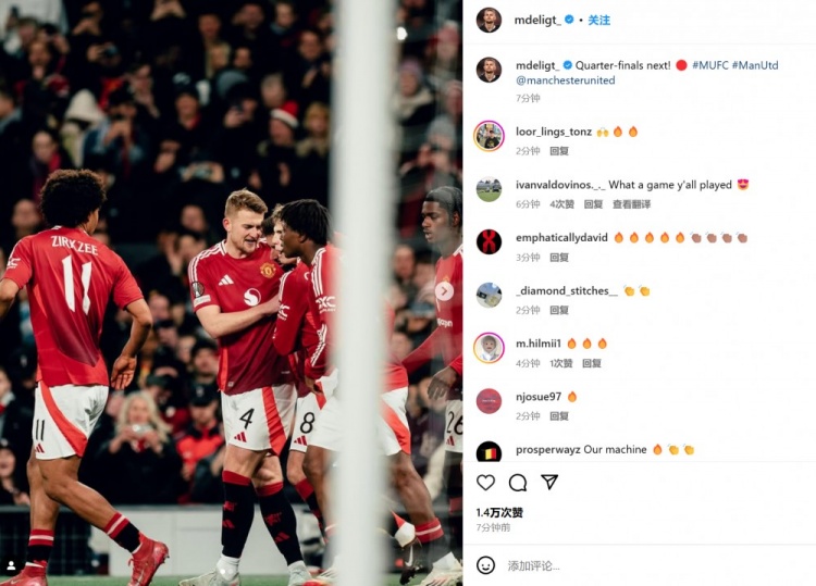 德里赫特也在賽后曬出和隊(duì)友的慶祝照,并配文:“下一站八強(qiáng)!@曼聯(lián)俱樂部?!?/p>