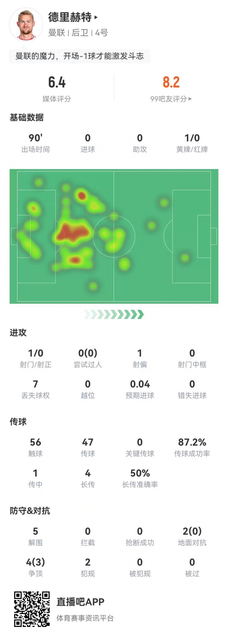 3月14日訊 曼聯(lián)在本場歐聯(lián)杯4-1大勝皇家社會,德里赫特本場數(shù)據(jù)如下: