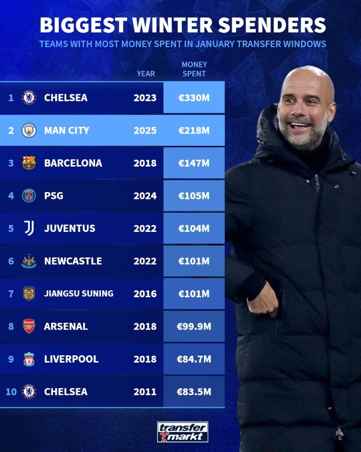 2月4日訊 2025年五大聯(lián)賽冬季轉(zhuǎn)會(huì)窗關(guān)閉,德轉(zhuǎn)列出了單個(gè)冬窗引援最高花銷榜單,今年的曼城花費(fèi)2.18億歐元排名歷史第二。