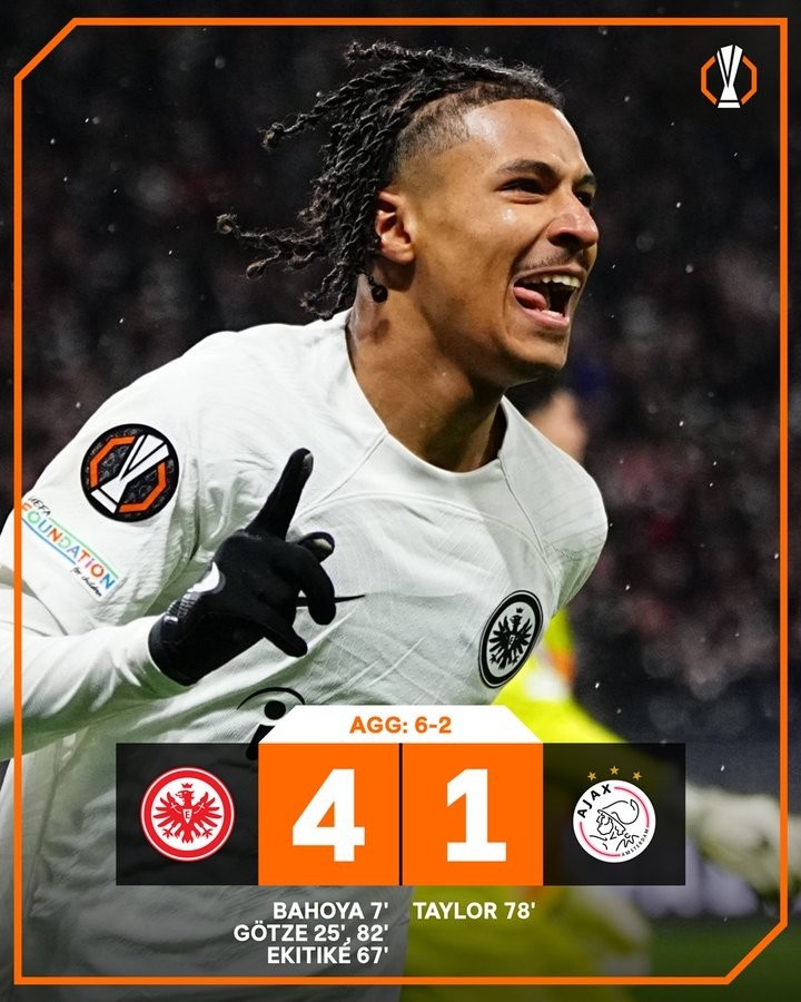 3月14日訊 法蘭克福在本輪歐聯杯主場4-1大勝阿賈克斯,兩回合總比分6-2雙殺對手。