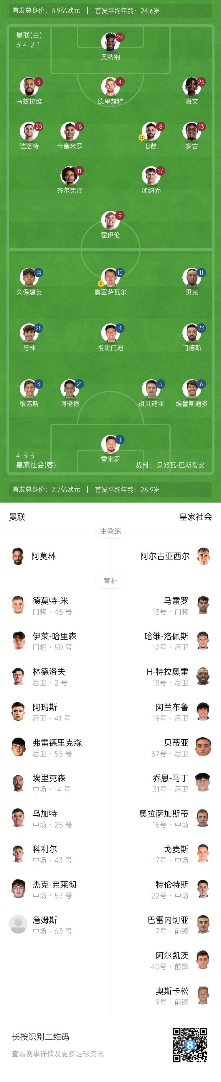 曼聯(lián)首發(fā):24-奧納納、3-馬茲拉維、4-德利赫特、26-海文、20-達洛特、18-卡塞米羅、8-B費、13-多古、17-加納喬、11-齊爾克澤、9-霍伊倫