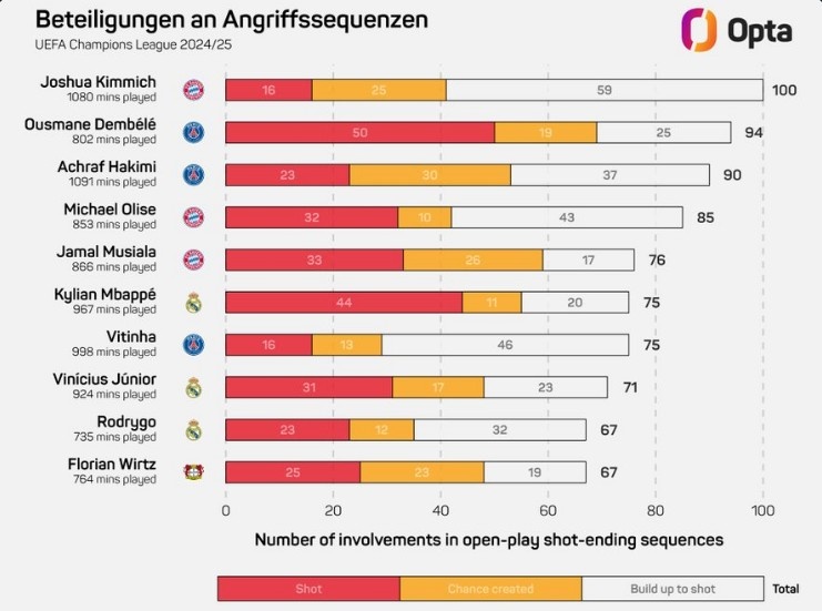 3月14日訊 拜仁官方宣布基米希與球隊續(xù)約,數(shù)據(jù)網(wǎng)站OPTA統(tǒng)計,基米希是本賽季歐冠運(yùn)動戰(zhàn)參與形成射門進(jìn)攻次數(shù)最多的球員,具體榜單如下(射門+創(chuàng)造機(jī)會+組織形成射門的進(jìn)攻):
