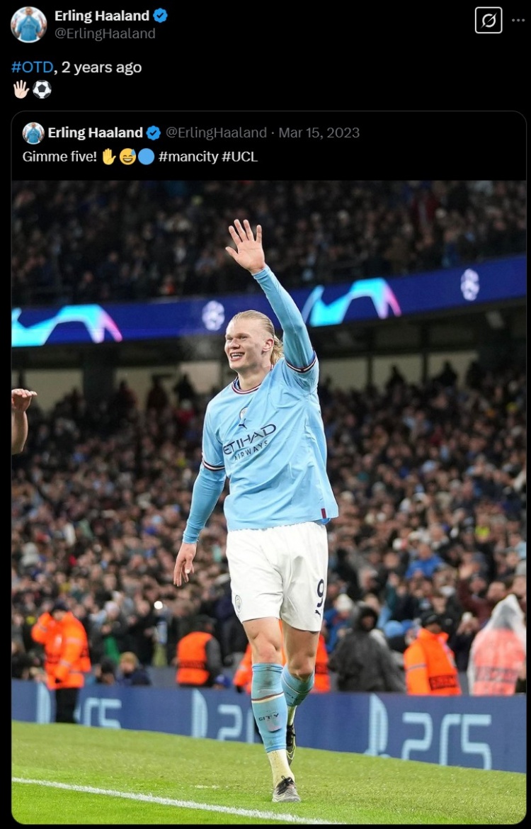 兩年前的今天哈蘭德歐冠上演五子登科,球員轉(zhuǎn)發(fā)自己當(dāng)時(shí)社媒