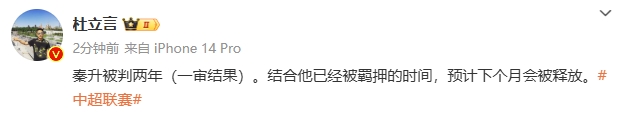 媒體人杜立言消息,秦升被判兩年(一審結(jié)果)。結(jié)合他已經(jīng)被羈押的時(shí)間,預(yù)計(jì)下個(gè)月會(huì)被釋放。 標(biāo)簽: 足球 中超 中國(guó)足球 轉(zhuǎn)載 Z原創(chuàng)