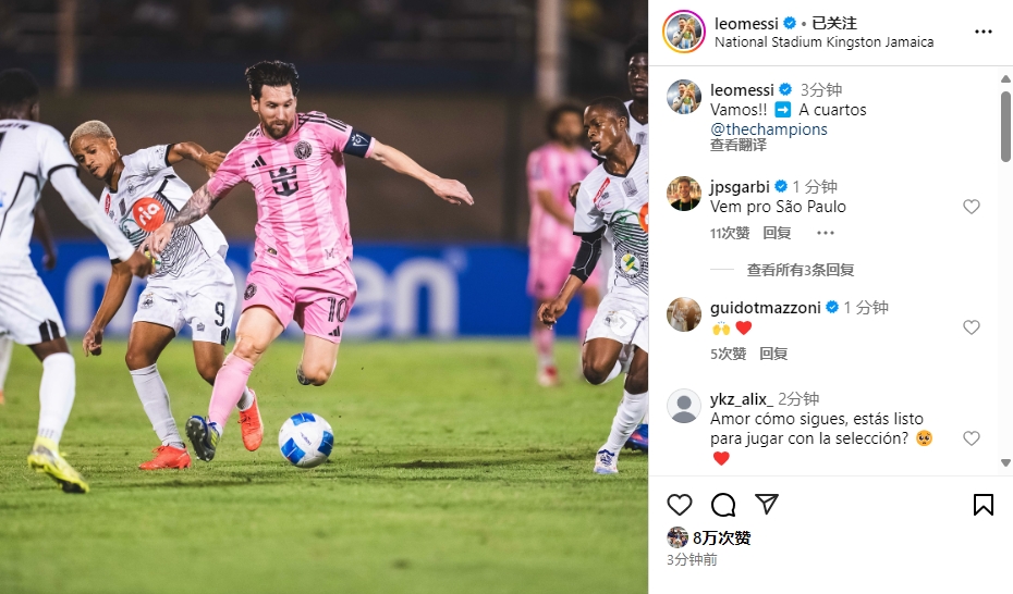 03月14日訊 中北美聯(lián)冠軍杯八分之一決賽次回合,梅西讀秒破門,邁阿密國際2-0卡瓦立爾。賽后梅西更新ins寫道:加油??!??進(jìn)入1/4決賽!1/4決賽邁阿密國際將對陣洛杉磯FC。 標(biāo)簽: 足球 梅西 邁阿密國際