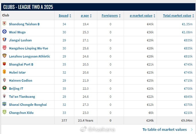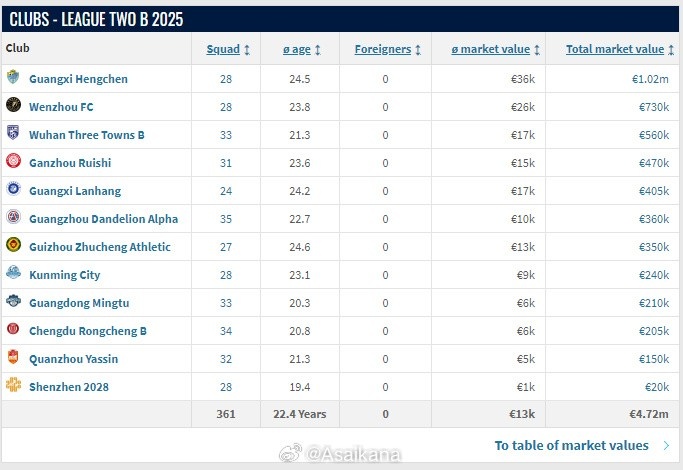 2025賽季中乙各隊名單已在轉會市場網更新。球隊總身價方面,山東泰山B隊以135萬歐元列第一,后面依次是無錫吳鉤(108萬歐)、廣西恒宸(102萬歐)、江西廬山(83.5萬歐)、杭州臨平吳越(83.5萬歐)、蘭州隴原競技(81萬歐)、上海海港B隊(74.5萬歐)、湖北青年星(74.5萬歐)、溫州(73萬歐)、南通海門珂締緣(71.5萬歐)、北京理工(70萬歐)、泰安天貺(64.5萬歐)、武漢三鎮(zhèn)B隊(56萬歐)、贛州瑞獅(47萬歐)、廣西藍航(40.5萬歐)、山西崇德榮海(37萬歐)、廣州蒲公英(36萬歐)、貴州筑城競技(35萬歐)、昆明城市(24萬歐)、廣東銘途(21萬歐)、長春喜都(21萬歐)、成都蓉城B隊(20.5萬歐)、泉州亞新(15萬歐)、深圳二零二八(2萬歐)。