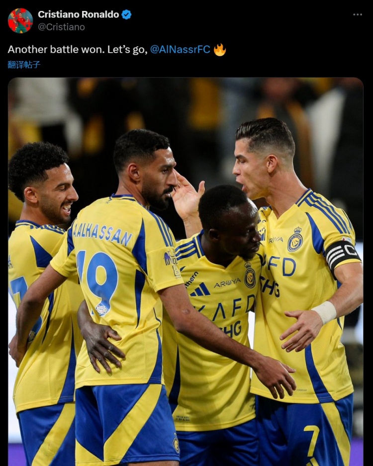 數據統計顯示這也是C羅生涯第928球,他也在賽后通過社媒曬出和隊友的慶祝照并配文:“又贏下一場戰(zhàn)斗,讓我們繼續(xù)前進!@利雅得勝利俱樂部”。