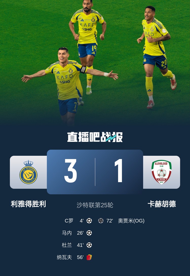 C羅破門(mén)+直塞策動(dòng),馬內(nèi)和杜蘭建功,十人利雅得勝利主場(chǎng)3-1戰(zhàn)勝卡赫胡德。