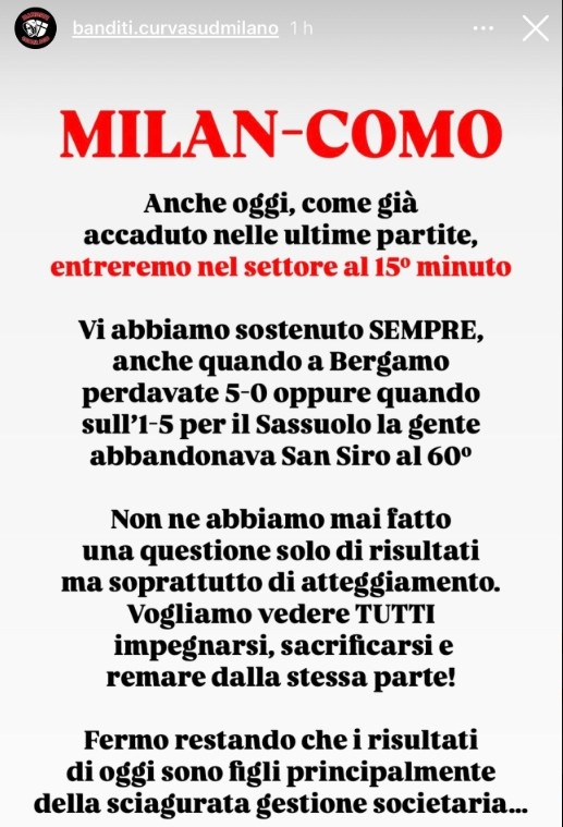 3月15日訊 米蘭南看臺發(fā)文,表示將在本輪對陣科莫的意甲聯(lián)賽繼續(xù)抗議。