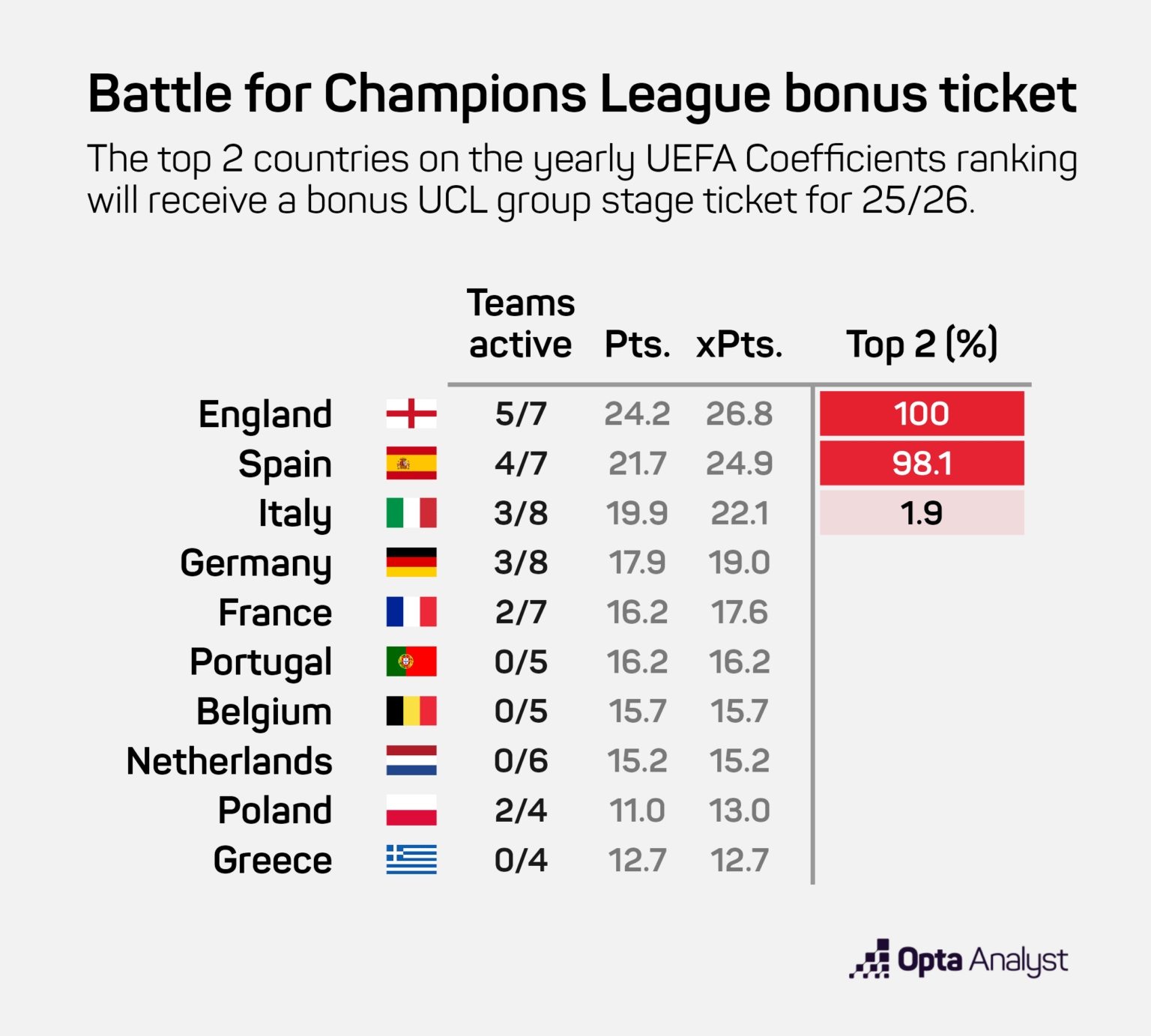 目前英格蘭手握24.25的積分,領(lǐng)先第二名西班牙2.5分。考慮到歐足聯(lián)系數(shù)分系統(tǒng)的運(yùn)作方式,在接下來的歐戰(zhàn)1/4決賽階段,只要有一支英格蘭球隊(duì)贏得一場(chǎng)比賽,就可以為英超鎖定一個(gè)額外的歐冠聯(lián)賽席位。