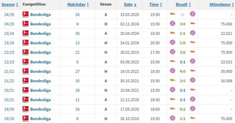 據(jù)德轉(zhuǎn)數(shù)據(jù)統(tǒng)計(jì),兩支球隊(duì)歷史上曾11次交手(均是德甲比賽),拜仁8勝3平未嘗敗績,共計(jì)打進(jìn)28球丟7球。
