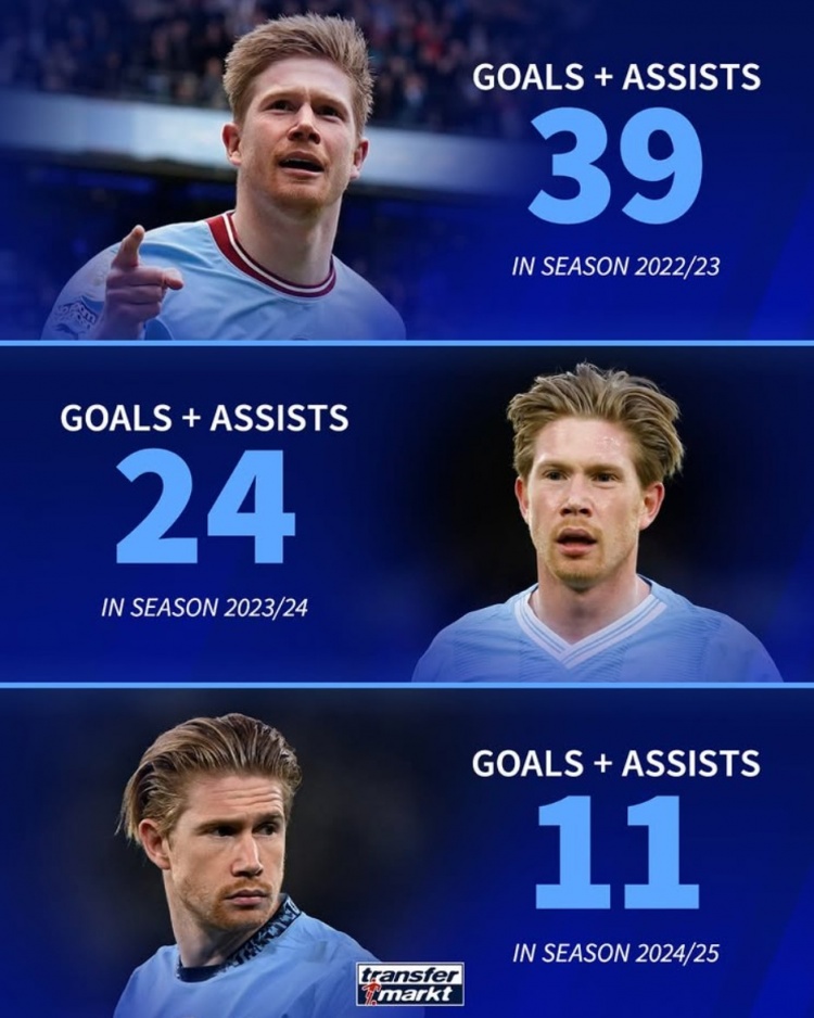 3月16日訊 曼城在本輪英超2-2戰(zhàn)平布萊頓,德布勞內(nèi)最后時(shí)刻替補(bǔ)登場,《轉(zhuǎn)會市場》統(tǒng)計(jì)顯示他的關(guān)鍵數(shù)據(jù)近年持續(xù)下滑: