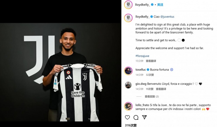 凱利通過社媒曬出自己手持尤文球衣的加盟照,并配文:“你好(ciao,意大利語),@尤文圖斯俱樂部。”