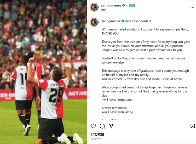 希門尼斯表示:“親愛的費(fèi)耶諾德球迷們,我現(xiàn)在百感交集,只想說一句簡單的話語:感謝你們。我發(fā)自心底感激你們給予我的一切,感謝你們所有的愛與激情。我希望我在此前已經(jīng)多少回報了一部分?!?/p>