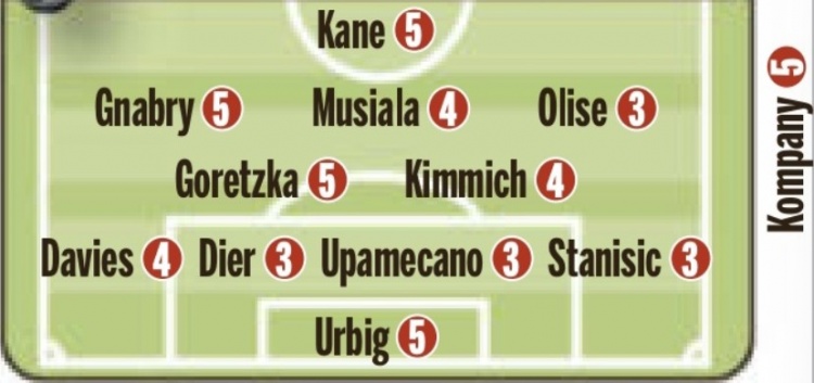 首發(fā):烏爾比希5分/戴維斯4分、戴爾3分、于帕梅卡諾3分、斯坦尼西奇3分/格雷茨卡5分、基米希4分/格納布里5分、穆西亞拉4分、奧利塞3分/凱恩5分