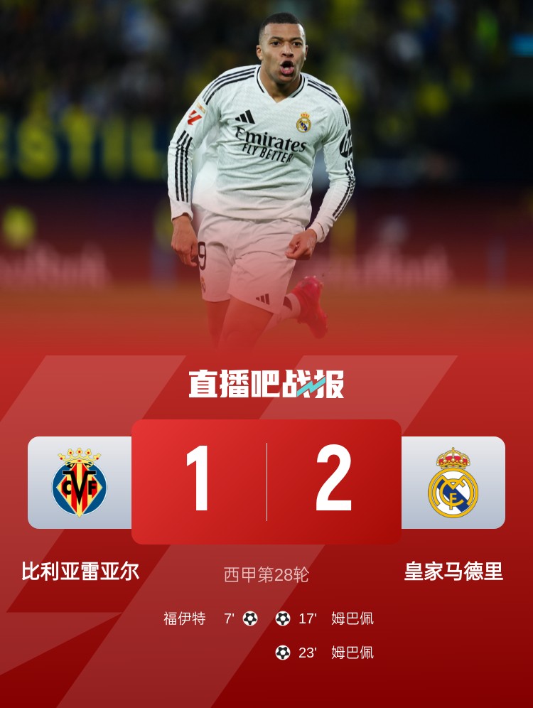 西甲第28輪,皇馬2-1逆轉比利亞雷亞爾,姆巴佩梅開二度。