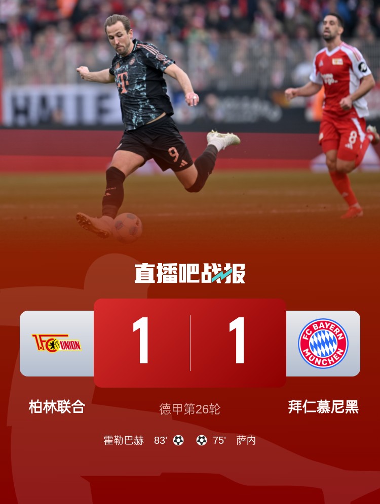 德甲第26輪,拜仁客場1-1柏林聯合,薩內替補建功,烏爾比希失誤。
