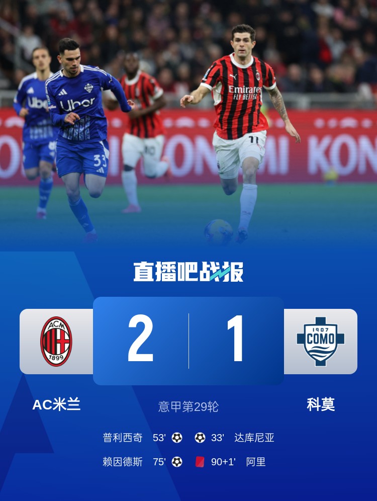 意甲第29輪AC米蘭2-1逆轉科莫,賴因德斯傳射,阿里首秀紅牌。