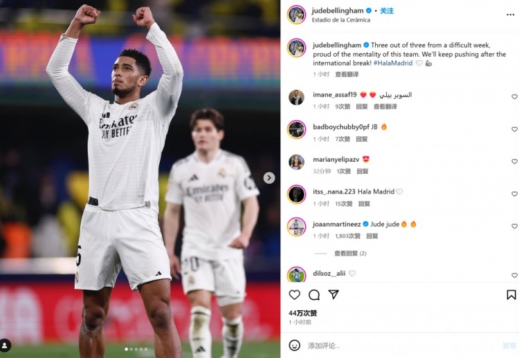 3天內(nèi)踢滿210分鐘!貝林社媒:一周3戰(zhàn),為球隊(duì)的意志力感到驕傲