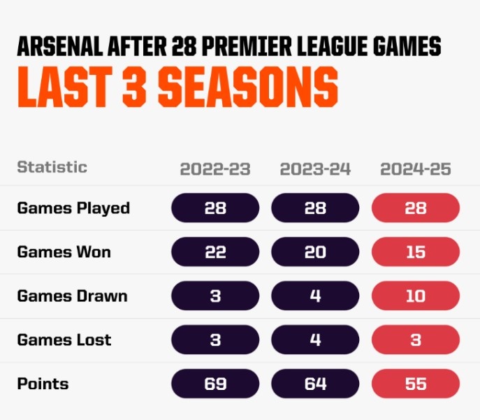 數(shù)據(jù)網(wǎng)站OPTA也盤點(diǎn)了阿森納近三個賽季28輪過后積分情況對比,具體如下: