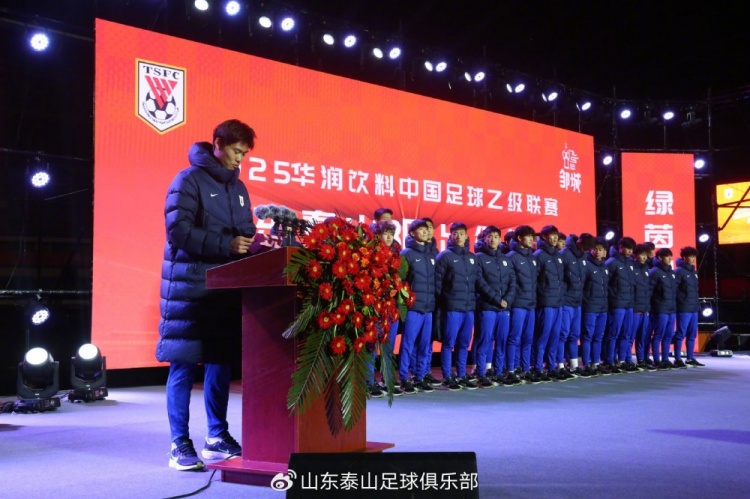 當(dāng)晚19時,出征儀式在激昂的樂隊表演中拉開帷幕。現(xiàn)場樂隊獻(xiàn)唱《逆戰(zhàn)》與《山東泰山隊隊歌》,點燃全場熱情。儀式由主持人開場后,依次播放了泰山B隊2024賽季回顧視頻,展現(xiàn)球隊拼搏歷程。鄒城市委副書記、市長王建文在致辭中表示,鄒城將全力支持賽事承辦,為球隊提供優(yōu)質(zhì)保障,山東泰山足球俱樂部副總經(jīng)理宿茂臻則對各界支持表達(dá)感謝,并強(qiáng)調(diào)新賽季將“以青訓(xùn)為根基,以成績?yōu)閯恿Α薄?/p>