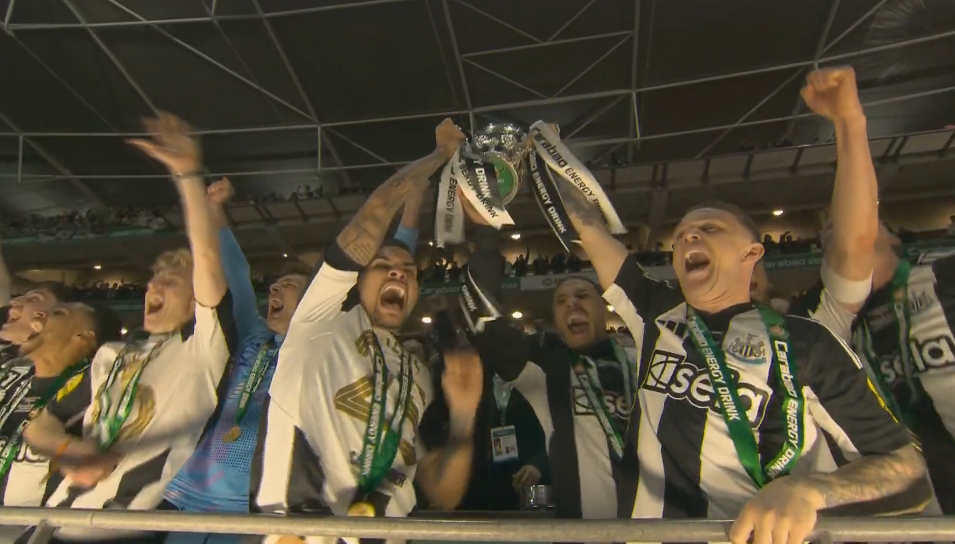 03月17日訊 紐卡擊敗利物浦奪得聯(lián)賽杯獎杯,終結隊史70年國內(nèi)頂級賽事冠軍荒。賽后頒獎儀式,特里皮爾和吉馬良斯捧起冠軍獎杯!47歲的埃迪-豪也來捧一下! 標簽: 足球 英超 紐卡斯爾聯(lián)