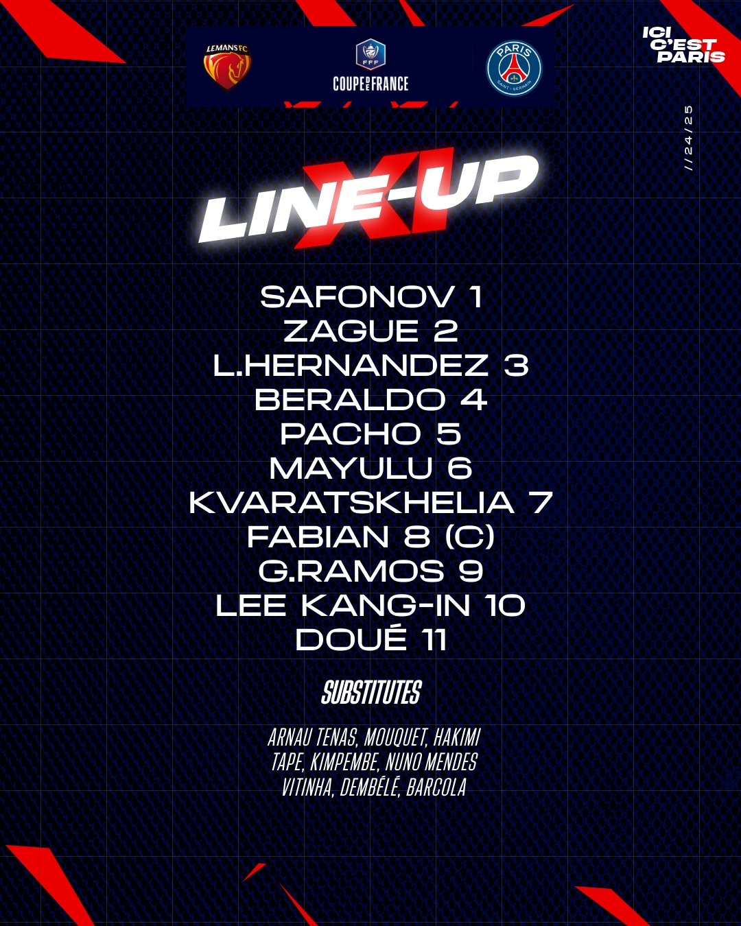 39-薩福諾夫、42-扎格、21-盧卡斯-埃爾南德斯、35-貝拉爾多、51-帕喬、24-馬尤盧、7-克瓦拉茨赫利亞、8-法比安-魯伊斯、9-貢薩洛-拉莫斯、19-李剛?cè)省?4-杜埃