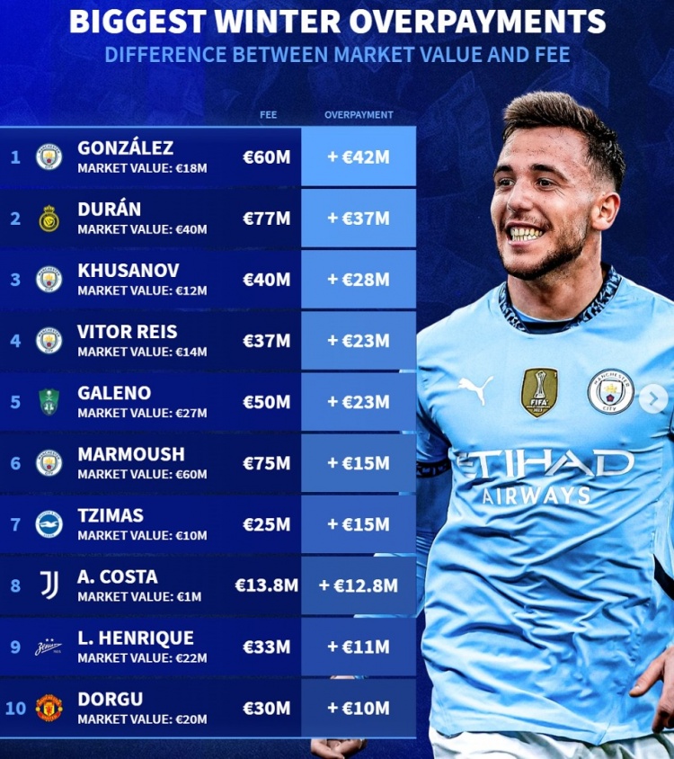 2月5日訊 五大聯(lián)賽冬窗已經(jīng)結(jié)束,《轉(zhuǎn)會(huì)市場(chǎng)》也列出了冬窗溢價(jià)引援榜,前六中曼城占據(jù)4席。
