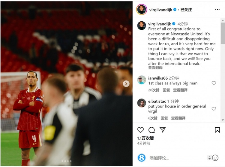 利物浦隊長范迪克社媒曬出自己賽后失落的照片,并寫道:“首先祝賀紐卡的每個人。對我們來說,這是艱難而令人失望的一周,現(xiàn)在我很難用言語來表達感受。我唯一能說的是,我們希望重新振作,我們會的!國際比賽日后再見。”