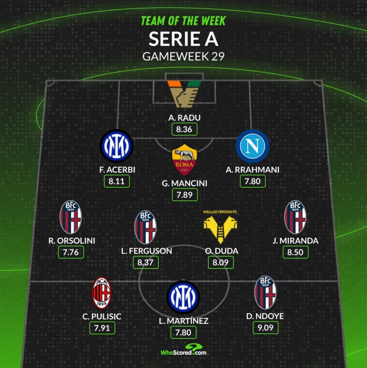 3月17日訊 WhoScored根據(jù)球員的評分列出了意甲第29輪最佳陣容,勞塔羅、阿切爾比、普利西奇在列,博洛尼亞4名球員入選。