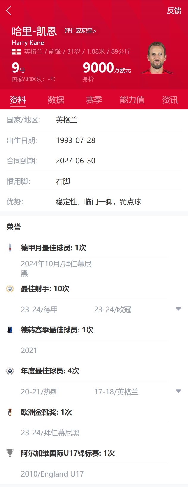 現(xiàn)年31歲的凱恩職業(yè)生涯攻入400多粒進(jìn)球、斬獲數(shù)十項個人榮譽,但至今還未隨球隊奪得過主要賽事冠軍。