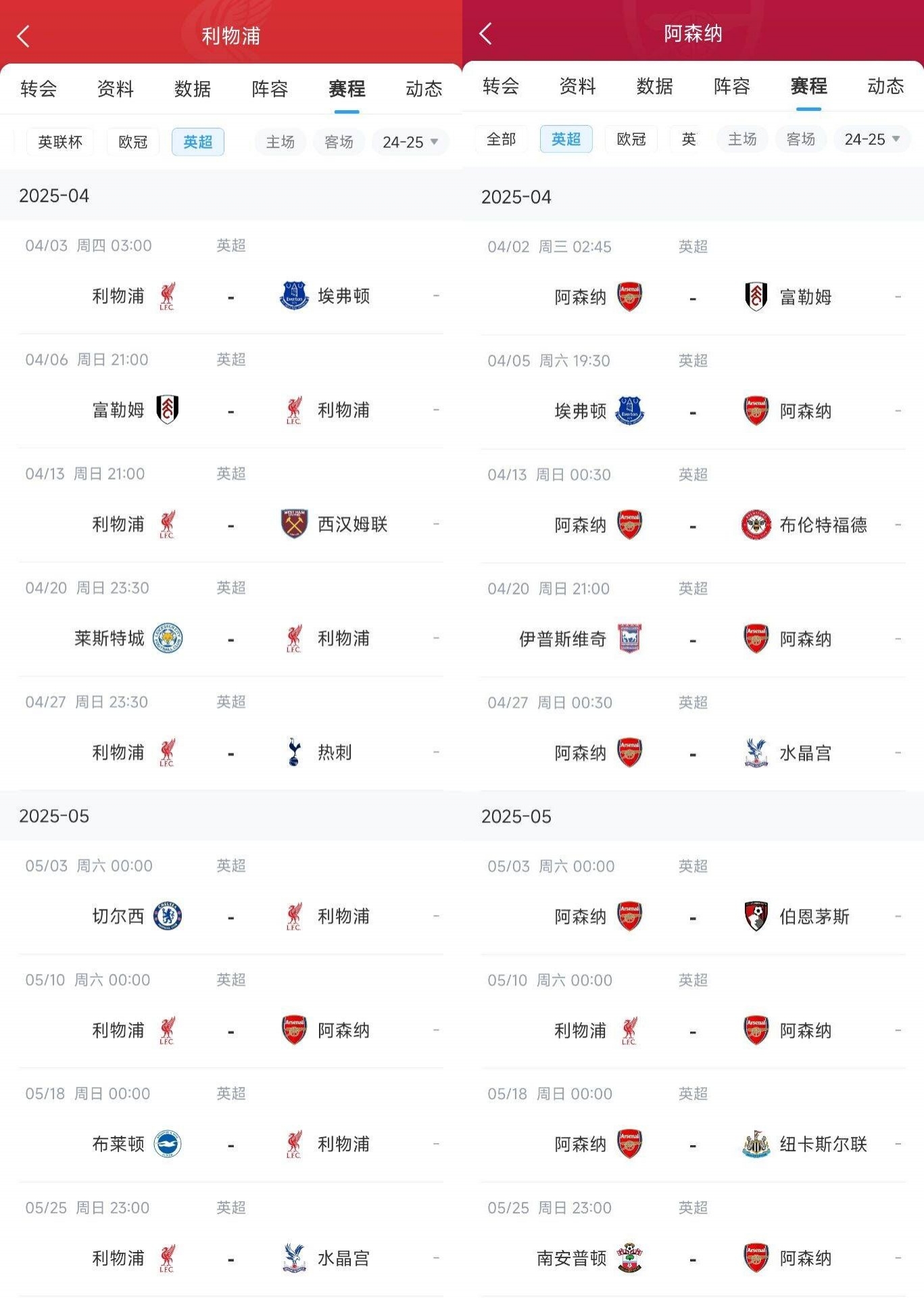 兩隊(duì)最后9輪的賽程對比如下,利物浦的對手稍微難一些,球隊(duì)將在35-37輪分別對陣切爾西、阿森納和布萊頓。此外第34輪對陣熱刺也不容忽視。阿森納所棘手的對手則主要是第36和37輪的利物浦和紐卡。
