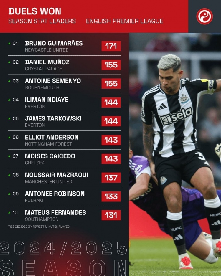 2月5日訊 squawka統(tǒng)計了本賽季英超成功對抗情況,吉馬良斯獨自居首。