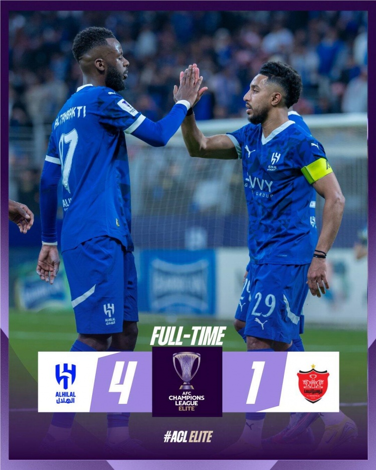 亞冠精英聯(lián)賽西亞區(qū)第7輪,利雅得新月4-1擊敗波斯波利斯。上半場(chǎng),馬爾科姆超級(jí)一條龍破門,坎塞洛擴(kuò)大優(yōu)勢(shì),多薩里連進(jìn)兩球。下半場(chǎng),布萊希送點(diǎn),格維勒西亞尼點(diǎn)射扳回一球。