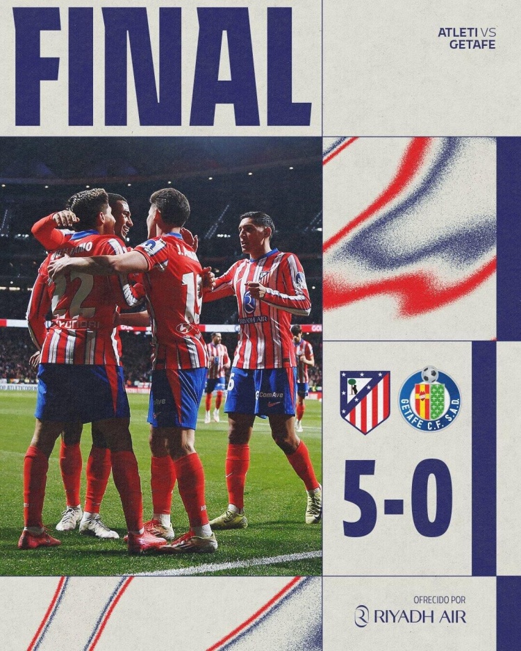 西班牙國(guó)王杯八強(qiáng)戰(zhàn),馬競(jìng)5-0赫塔菲晉級(jí)四強(qiáng)。上半場(chǎng),小西蒙尼雙響,阿爾瓦雷斯助攻利諾破門+失單刀;下半場(chǎng),小西蒙尼破門無效,科雷亞傳射建功,索爾洛特推射破門。