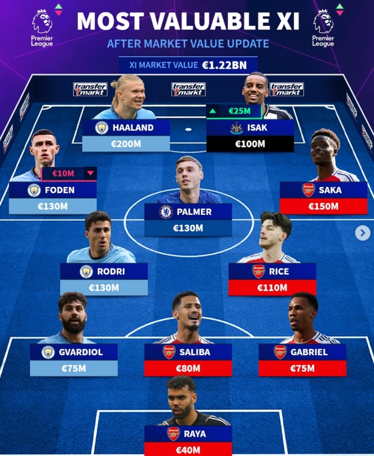 中場:福登(曼城,1.3億)、羅德里(曼城,1.3億)、帕爾默(切爾西,1.3億)、賴斯(阿森納,1.1億)、薩卡(阿森納,1.5億)