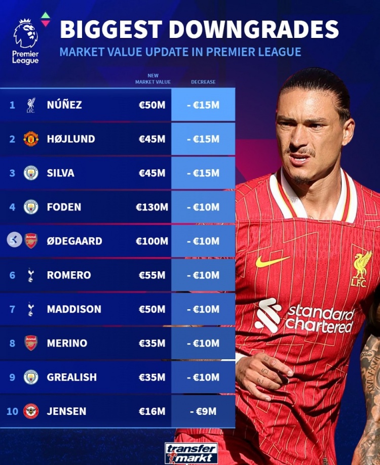 德轉(zhuǎn)列英超球員貶值榜:歐元