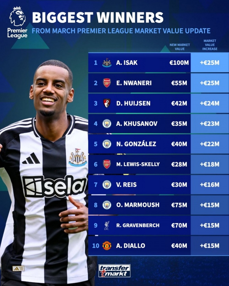 3月19日訊 《轉(zhuǎn)會市場》更新了英超球員身價(jià),并列出了本期球員身價(jià)上漲榜單,曼城4名新援均上榜。