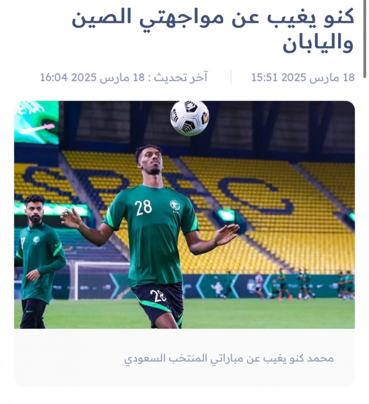 來(lái)自沙特國(guó)家隊(duì)訓(xùn)練營(yíng)的消息稱,,穆罕默德-卡努的檢查結(jié)果顯示,他將缺陣10至15天,因此將無(wú)緣對(duì)陣中國(guó)和日本的兩場(chǎng)比賽。沙特國(guó)家隊(duì)官方社媒賬號(hào)透露,該球員因傷未參加昨天的訓(xùn)練,只是繼續(xù)按計(jì)劃接受治療。