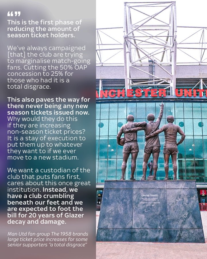 the 1958表示:“這是減少季票持有者數(shù)量的第一階段,我們一直反對俱樂部將球迷邊緣化的做法。將原有的50%的優(yōu)惠削減至25%,這完全是一種恥辱?!?/p>