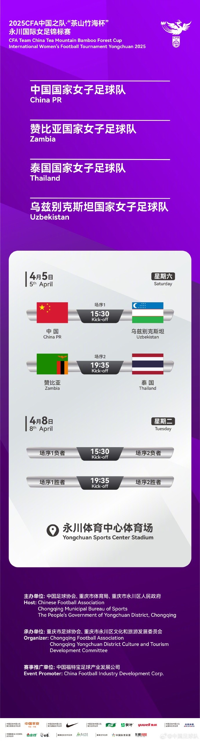 【賽事通知】2025CFA中國之隊(duì)“茶山竹海杯”永川國際女足錦標(biāo)賽將于4月5日、8日在永川體育中心體育場進(jìn)行。 標(biāo)簽: 足球 國家隊(duì) 中國女足 中國足球 中超