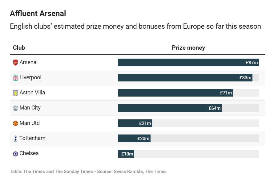 本賽季歐足聯(lián)調(diào)整了歐戰(zhàn)收入分配體系,使賽季期間的表現(xiàn)獲得更多經(jīng)濟(jì)回報而非依賴歷史成績。與上賽季相比,歐冠的總獎金池增加了20%以上,歐足聯(lián)為比賽勝利、小組賽階段積分榜排名以及晉級淘汰賽提供了比例更高的獎金。而基于俱樂部歷史表現(xiàn)計算的歐足聯(lián)系數(shù)排名所占的獎金比例減少。例如,曼城未能進(jìn)入淘汰賽階段,其預(yù)計收入約為6400萬英鎊;而阿斯頓維拉晉級四分之一決賽后至少賺了7100萬英鎊。