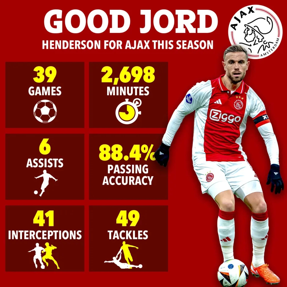 本賽季,喬丹-亨德森在阿賈克斯發(fā)揮不俗,他出戰(zhàn)39場比賽共計(jì)2698分鐘,貢獻(xiàn)6次助攻,傳球成功率88.4%,同時(shí)還有41次攔截和49次鏟搶。