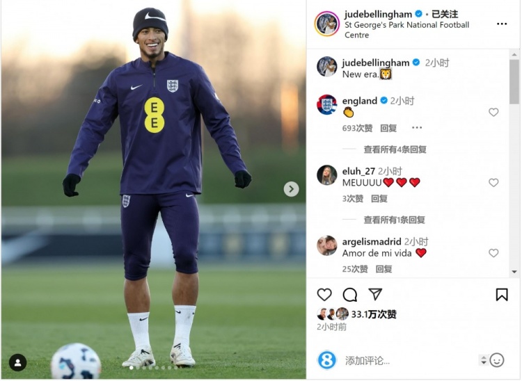 貝林厄姆隨英格蘭隊備戰(zhàn)世預(yù)賽,他在社交媒體上曬出訓(xùn)練照片,并配文:“新時代????”