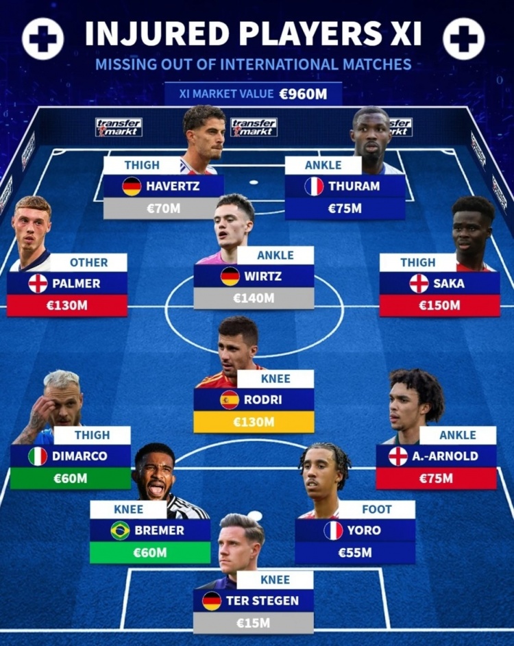 德轉(zhuǎn)列傷缺國(guó)家隊(duì)陣容:薩卡、維爾茨、羅德里在列,總價(jià)9.6億歐