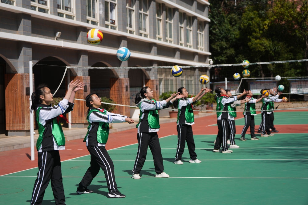 2025年2月28日,昆明市云南大學(xué)附屬中學(xué)學(xué)生在校園里練習(xí)排球。新華社記者 陳欣波 攝