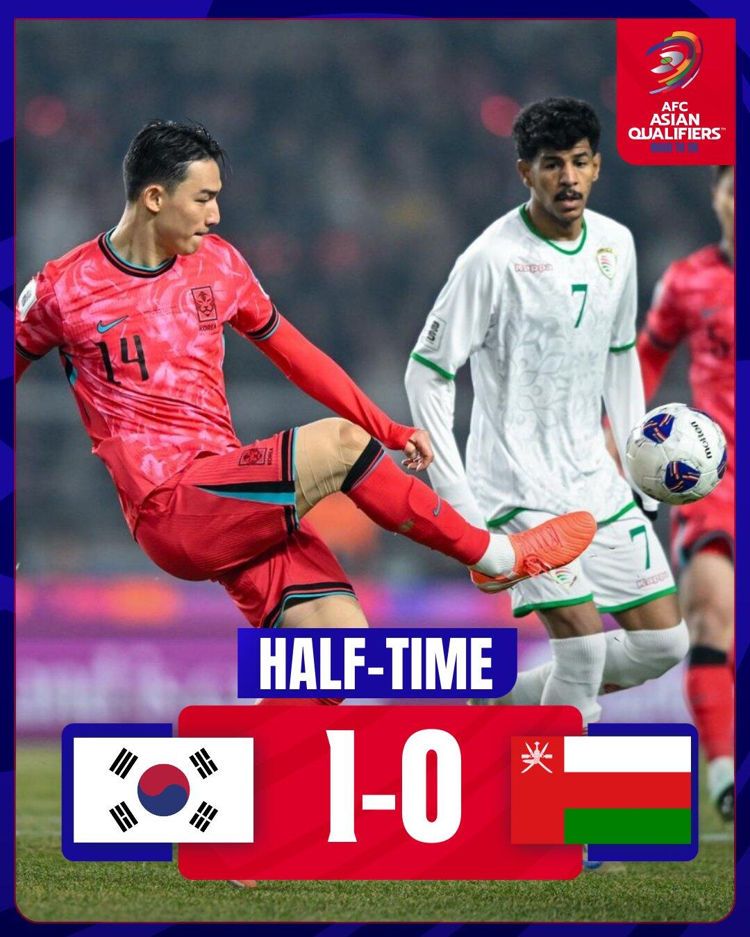 半場(chǎng)戰(zhàn)罷,韓國隊(duì)暫1-0阿曼隊(duì)。