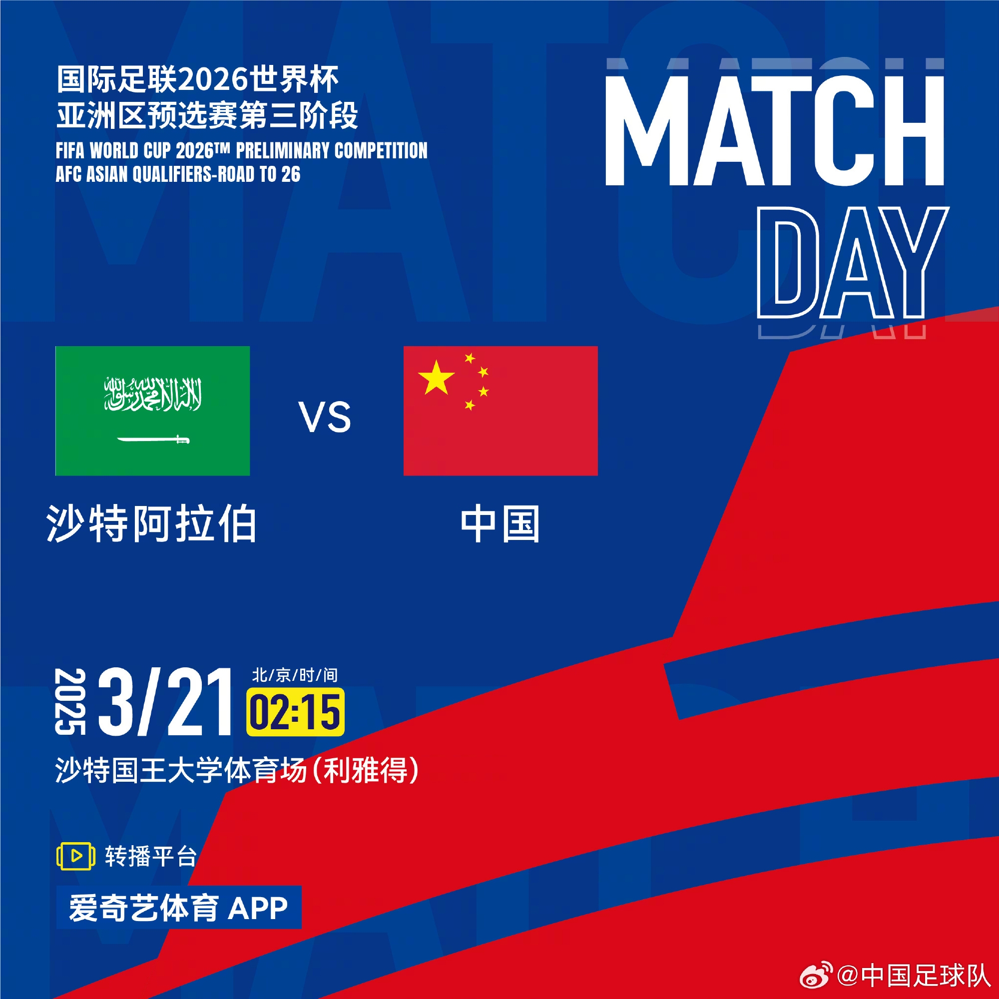 北京時間3月21日凌晨02:15,國際足聯(lián)2026世界杯亞洲區(qū)預(yù)選賽第七輪-中國國家男子足球隊將在利雅得沙特國王大學(xué)體育場對陣沙特阿拉伯國家男子足球隊。鎖定以下轉(zhuǎn)播平臺,一起為中國隊加油!